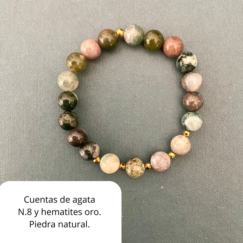 Usamos bolones N. 8 de agata de la India natural, micro hematites oro y una bolita de acero dorado en la terminacion para ocultar la union.